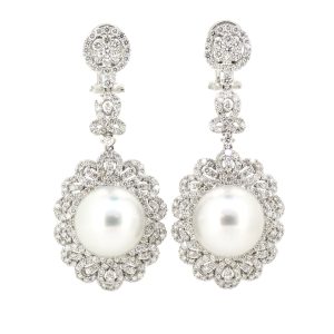 LOT 789 – EARRINGS NATURAL WHITE SOUTH SEA PEARLS 13.29-13.38MM. TONE: SILVER PINK, DIAMONDS 4.05CT.TW. 18K