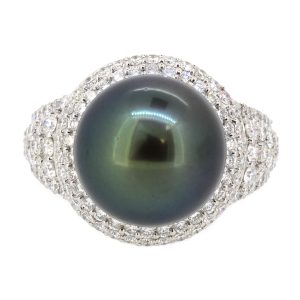 LOT 733 – RING NATURAL BLACK SOUTH SEA TAHITIAN 12.42MM. DIAMONDS 1.35CT.TW. 18K