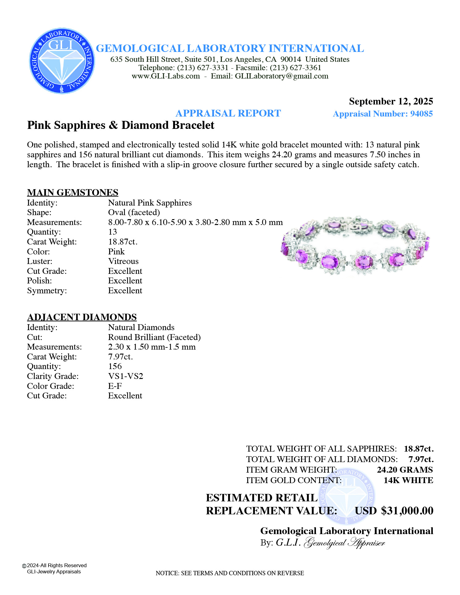 LOT 863 – BRACELET OVAL SHAPE PINK SAPPHIRES 18.87CT.TW. DIAMONDS 7.97CT.TW. 14K