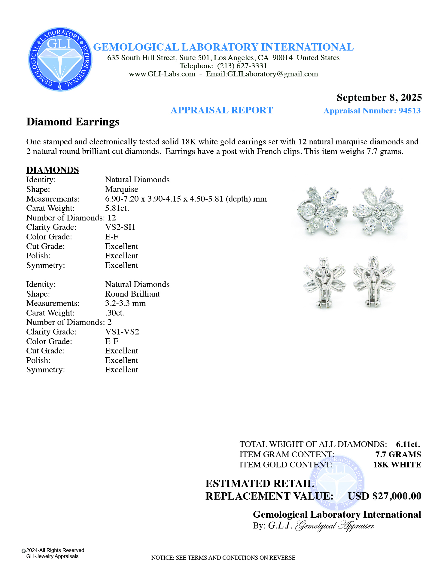 LOT 13 – EARRINGS (14) ROUND AND MARQUISE NATURAL DIAMONDS 6.11CT.TW. 18K