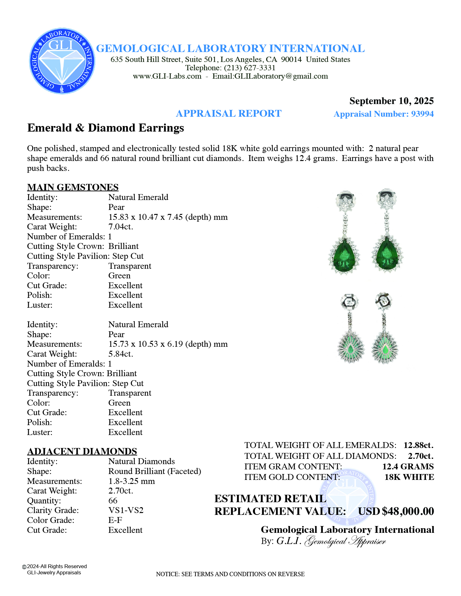 Earrings (1) Pear Shape Emerald 7.04ct (1) Pear Shape Emerald 5.84ct (Total Weight of Emeralds 12.88ct.tw)
