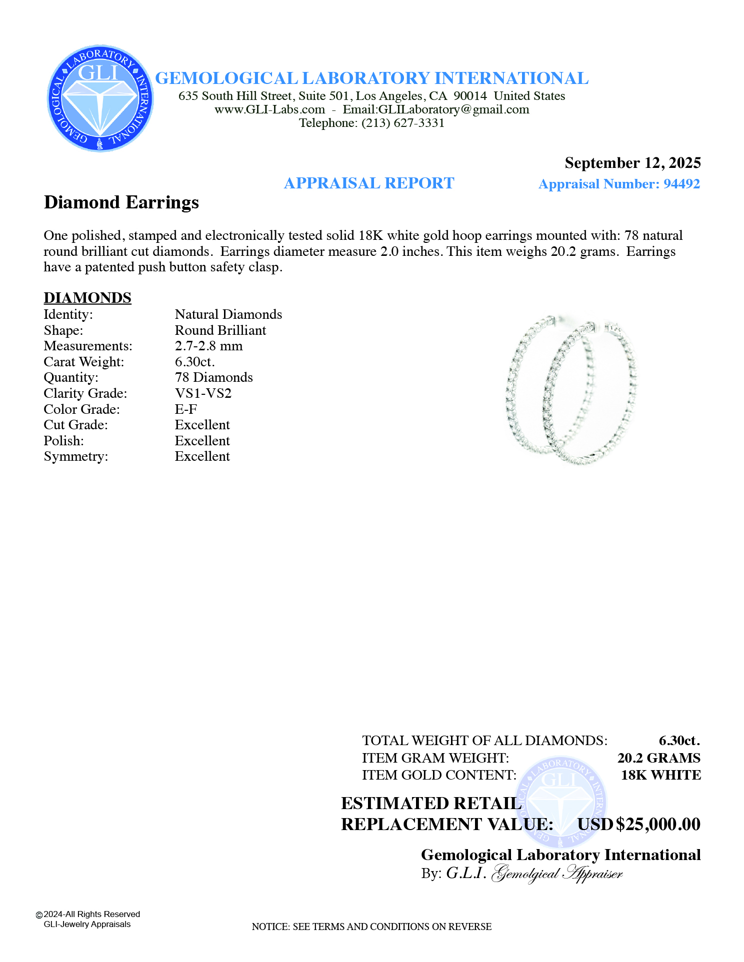 Earrings Hoop Design (78) Round Brilliant Natural Diamonds 6.30ct.tw