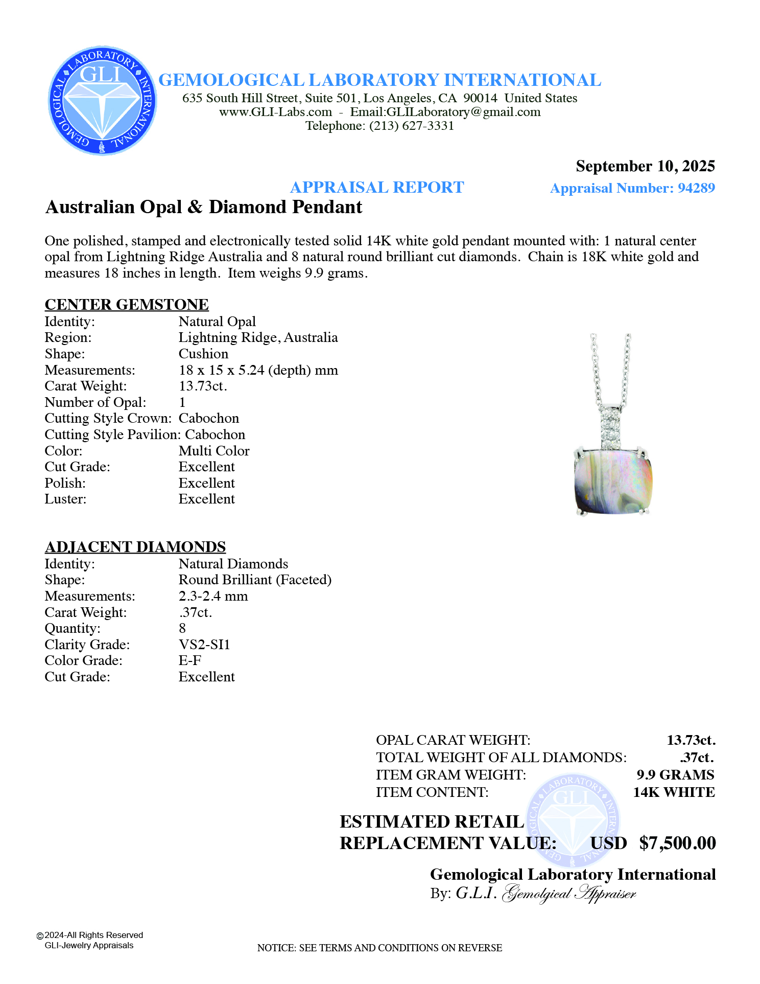 LOT 379 – PENDANT – CENTER AUSTRALIAN NATURAL OPAL 13.73ct. DIAMONDS .37ct.tw. 14K