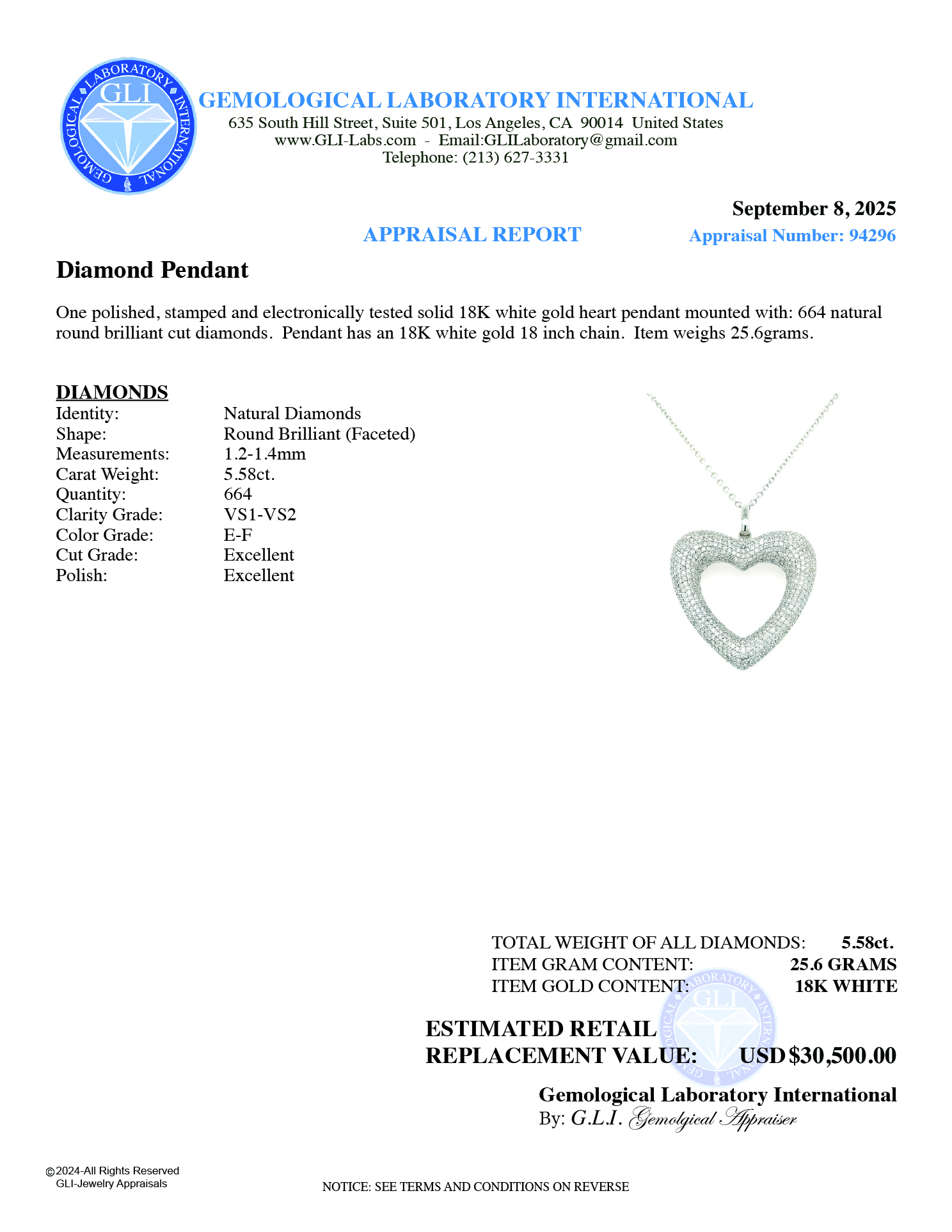 Pendant Heart Shape (664) Round Brilliant Natural Diamonds 5.58ct.tw Adjacent 18 inch Chain