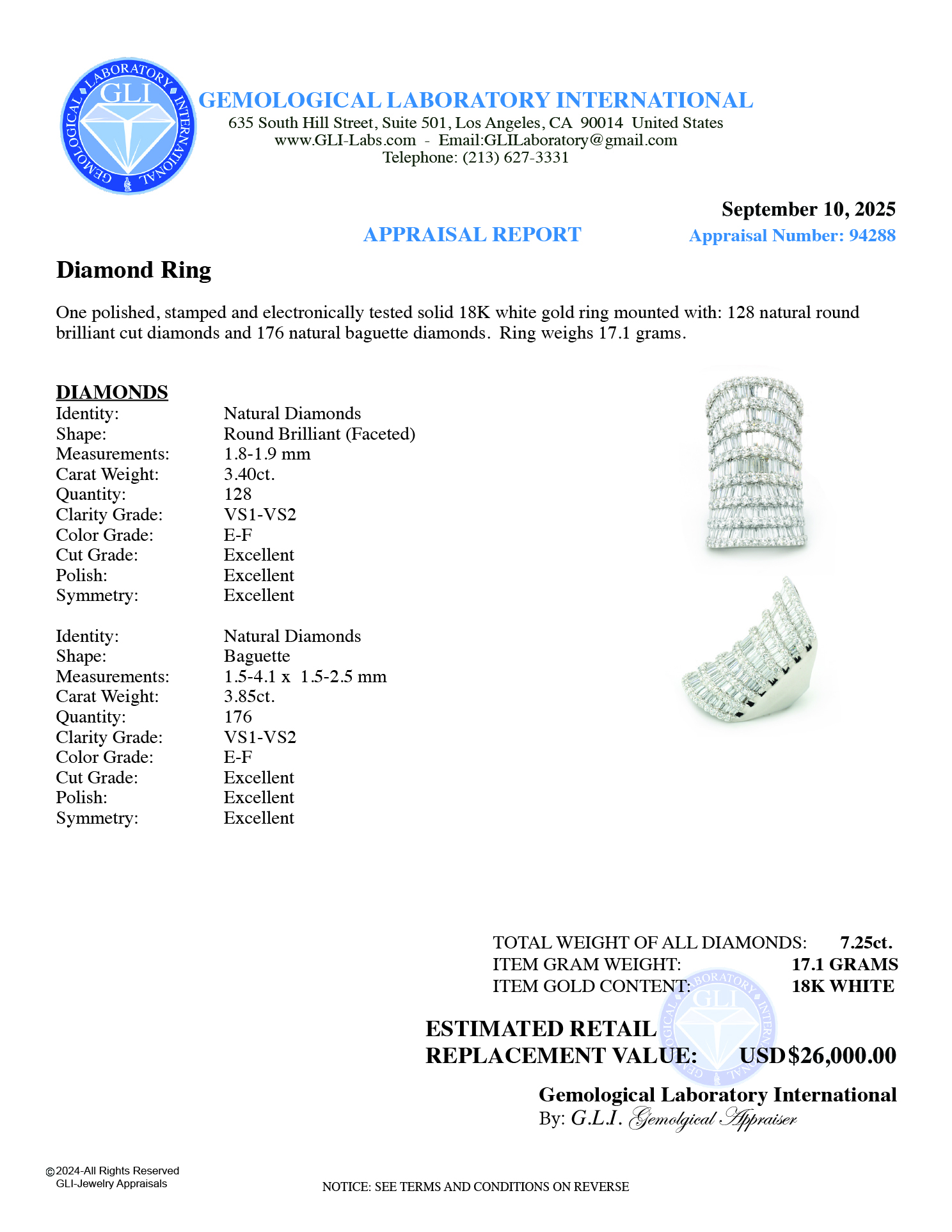 Adjacent (176) Natural Baguette Diamonds 3.85ct.tw (Total Diamonds 304) Total Weight of All Diamonds 7.25ct.tw