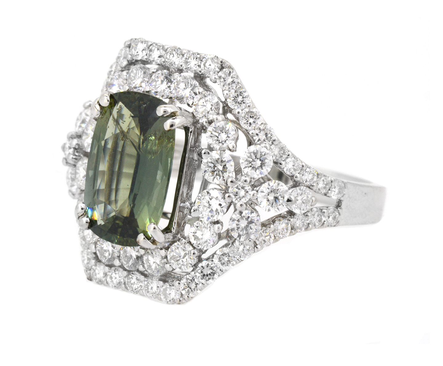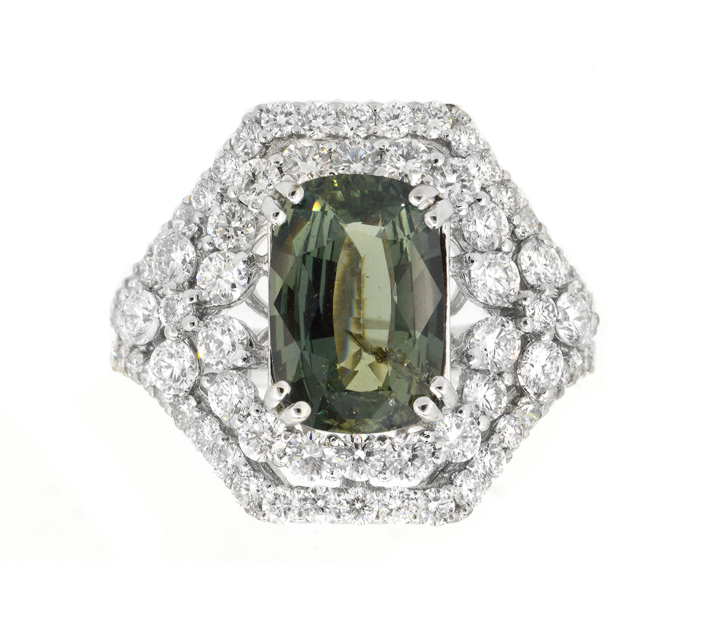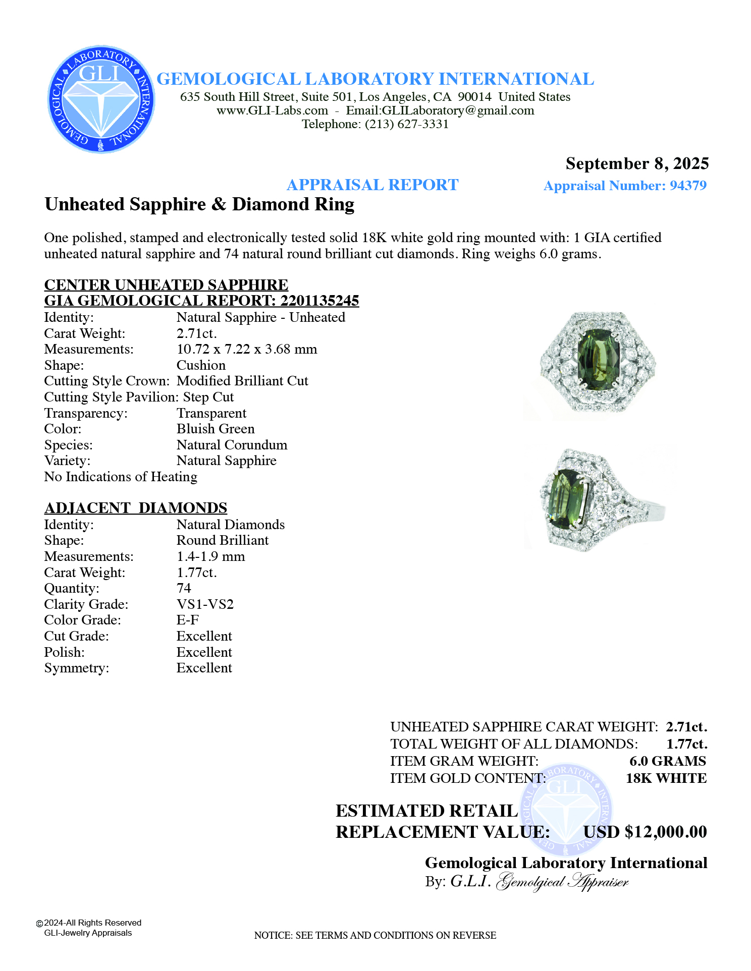Ring Center Cushion Shape Natural Unheated Sapphire 2.71ct. Color: Bluish Green (GIA Gemological Report: 2201135245) No Indication of Heating Adjacent (74) Natural Round Brilliant Diamonds 1.77ct.tw