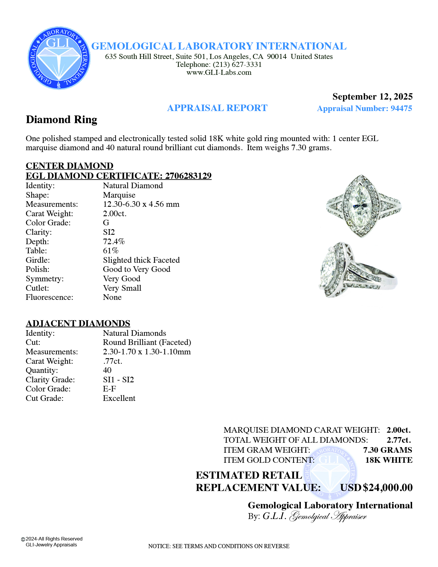 Ring Center Marquise Shape Natural Diamond 2.00ct., Clarity SI-2 Color G (EGL Certificate 2706283129)