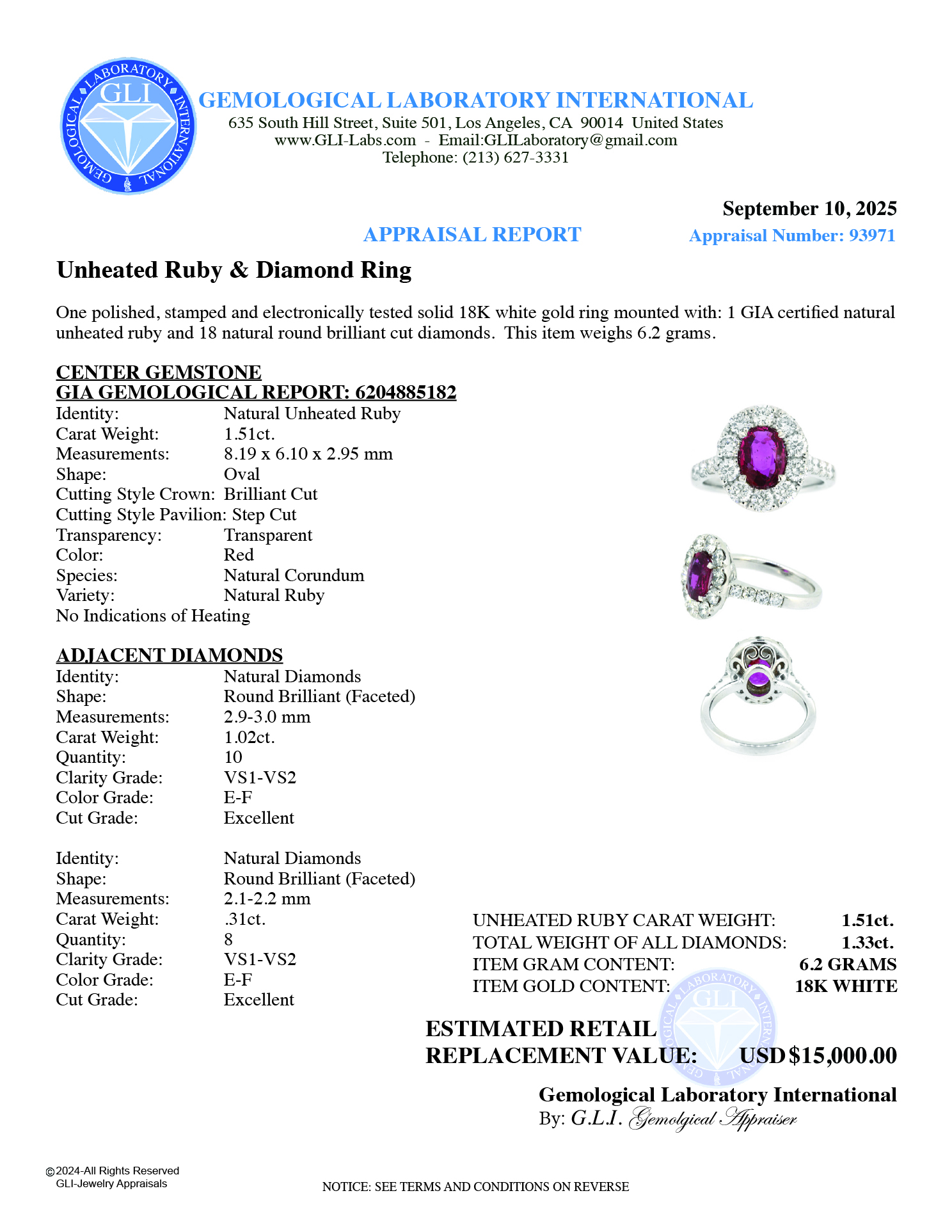 Ring Center Natural Oval Shape Unheated Ruby 1.51ct. (GIA Gemological Report: 6204885182) No Indication of Heating