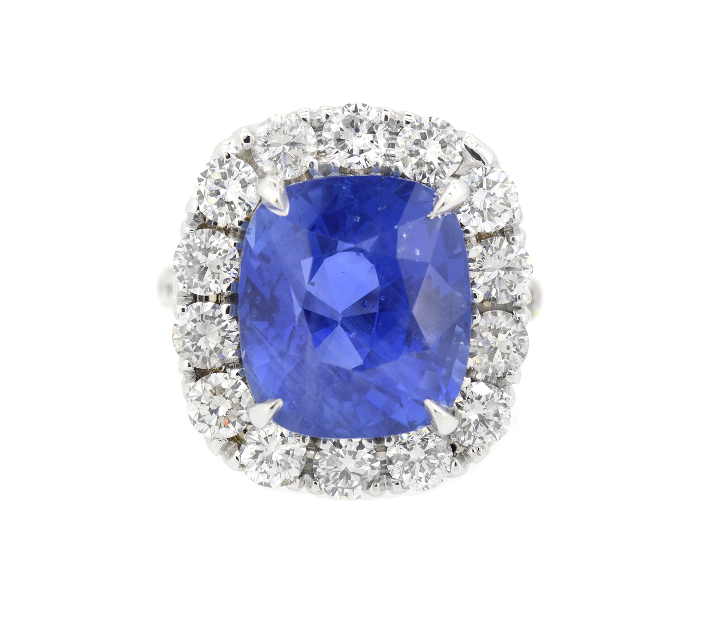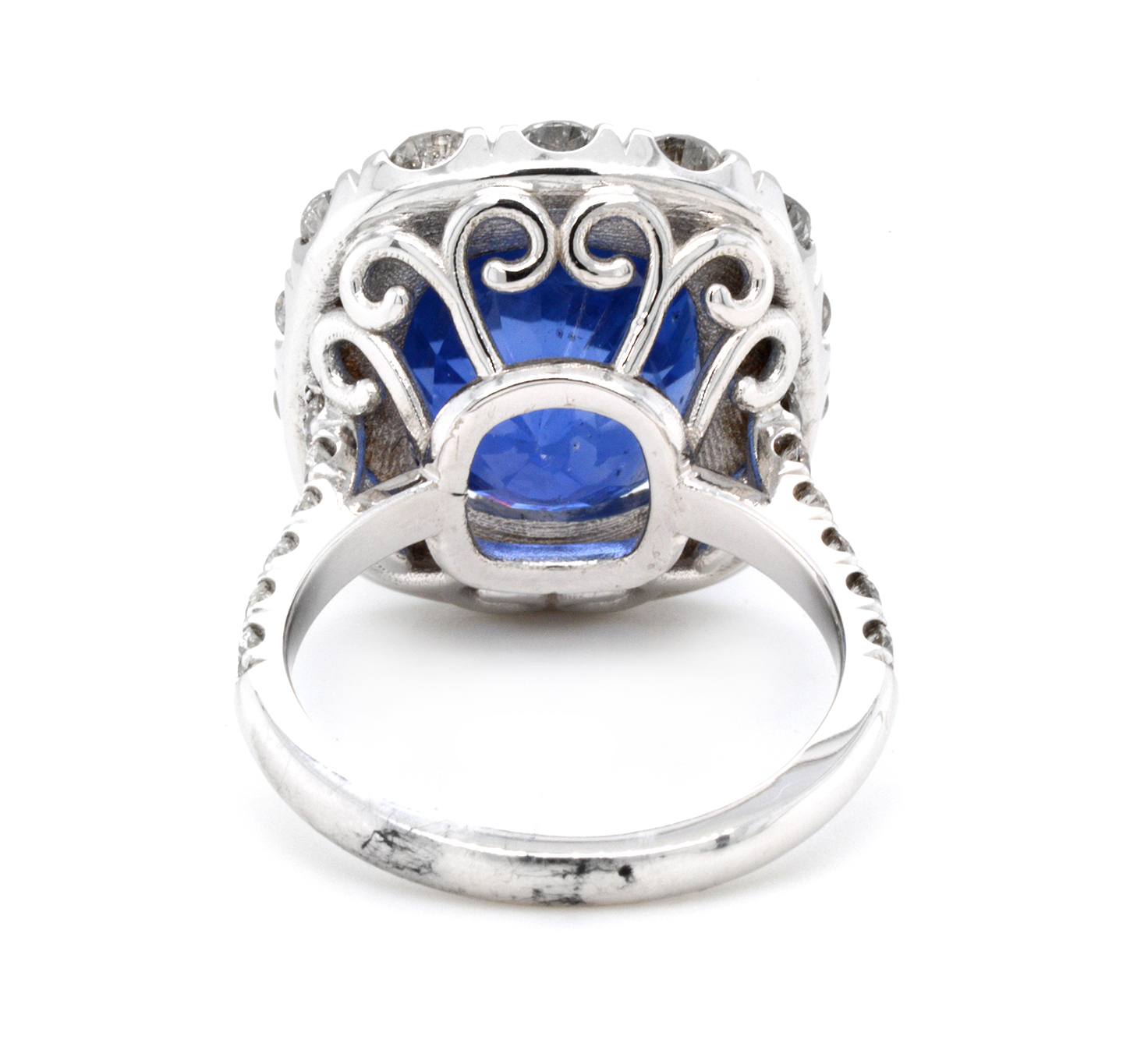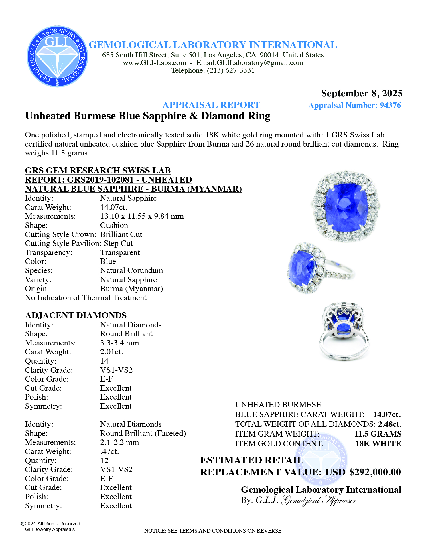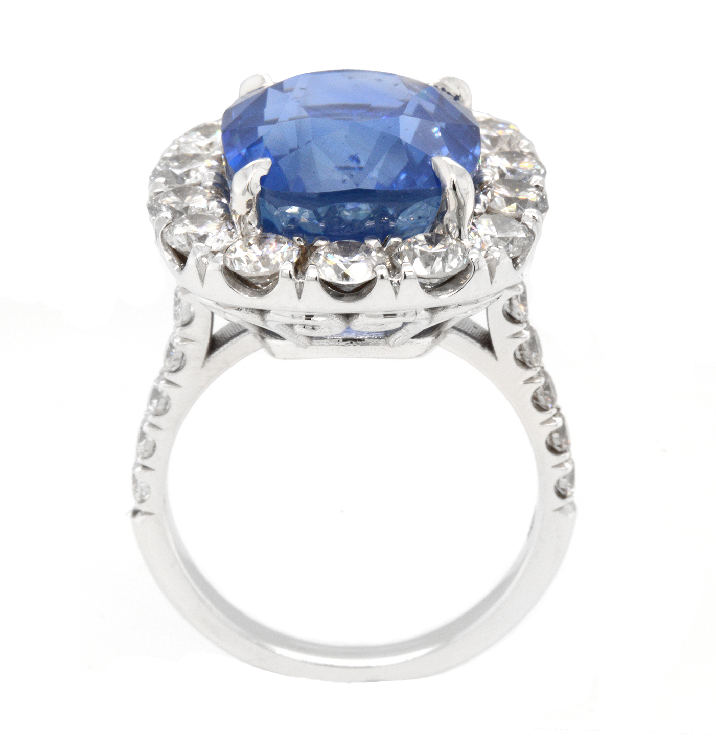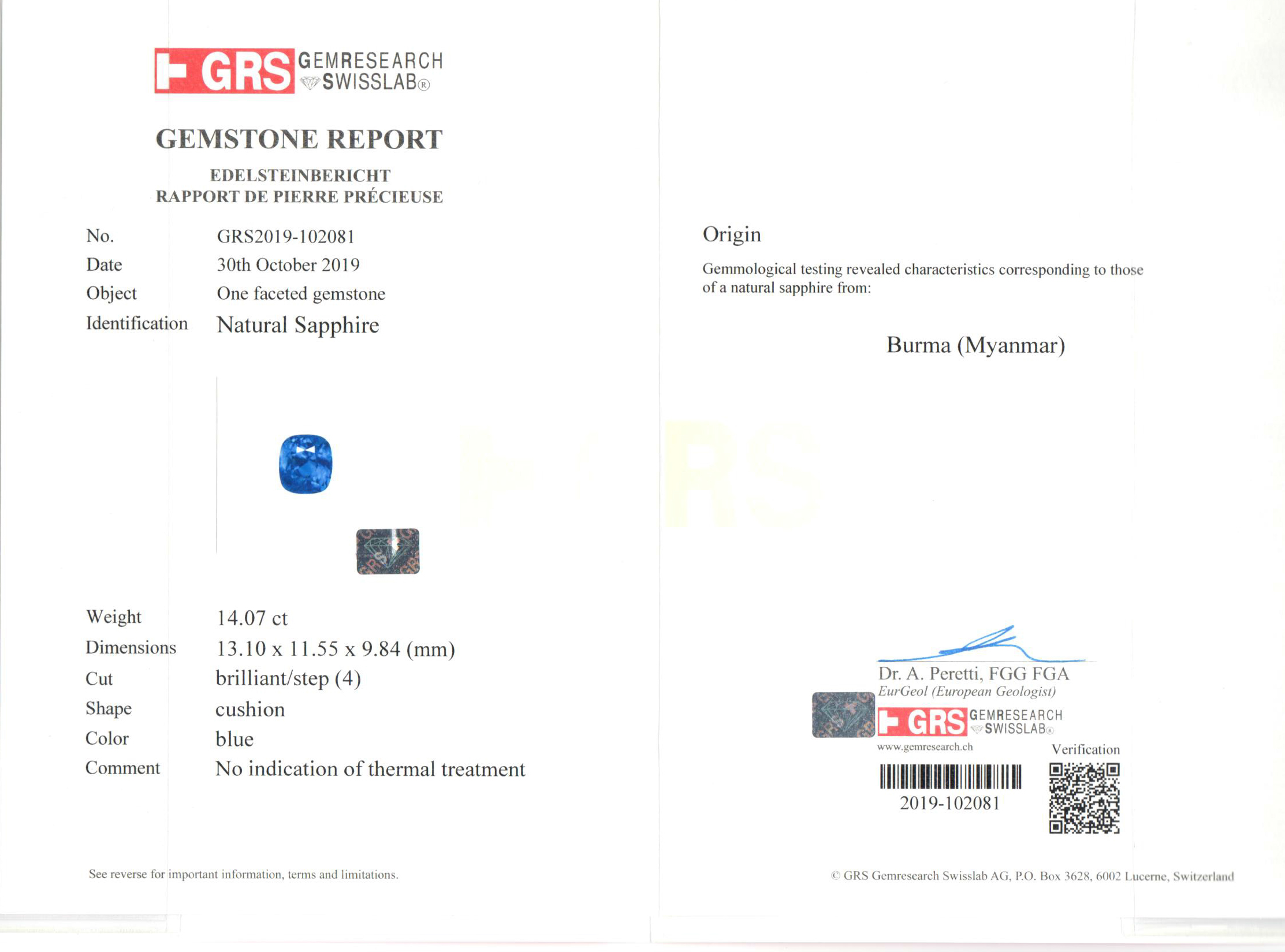 Ring Center Unheated Cushion Shape Natural Blue Sapphire 14.07ct. Origin: Burma (Myanmar) No Indication of Thermal Treatment (GRS Gem Research Laboratory Report: GRS2019-102081)