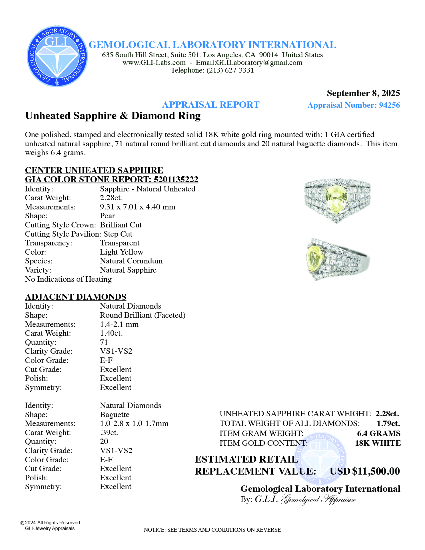 Ring Center Pear Shape Natural Unheated Sapphire 2.28ct. Color: Light Yellow (GIA Color Stone Report: 520135222) No Indication of Heating Adjacent (91) Natural Round Brilliant and Baguette Diamonds 1.79ct.tw