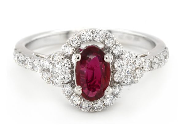 Ring Center Natural Oval Shape Unheated Ruby .81ct (GIA Gemological Report: 1192444726) No Indication of Heating Adjacent (36) Round Brilliant and Natural Diamonds .62ct.tw 18K White Gold.