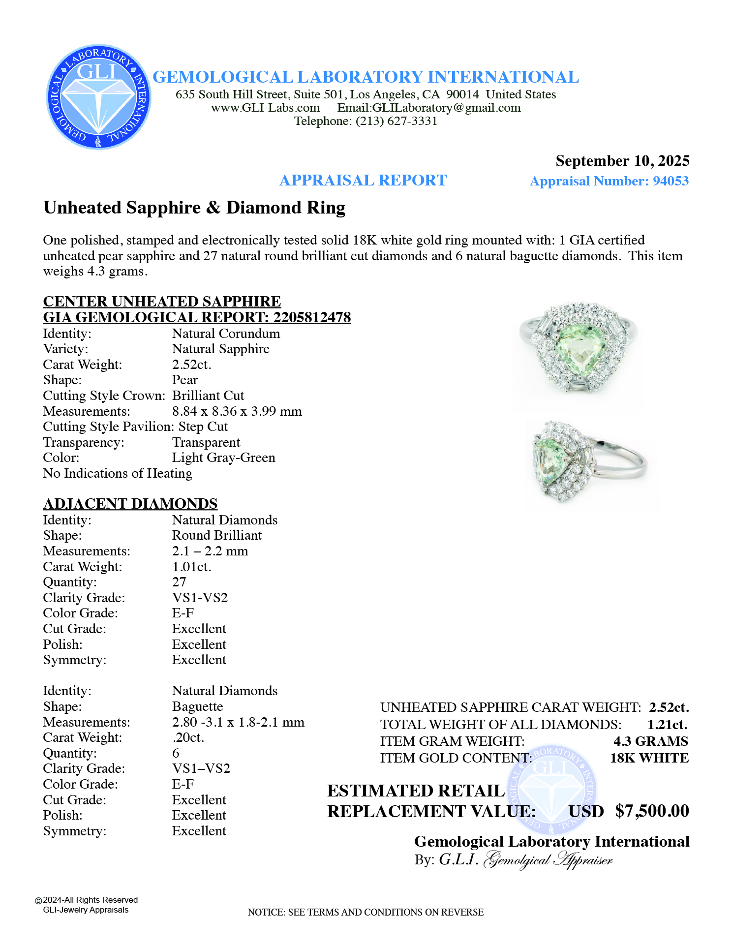 Ring Center Unheated Pear Shape Natural Sapphire 2.52ct Color: Light Gray-Green (GIA Color Stone Report: 2205812478) No Indication of Heating