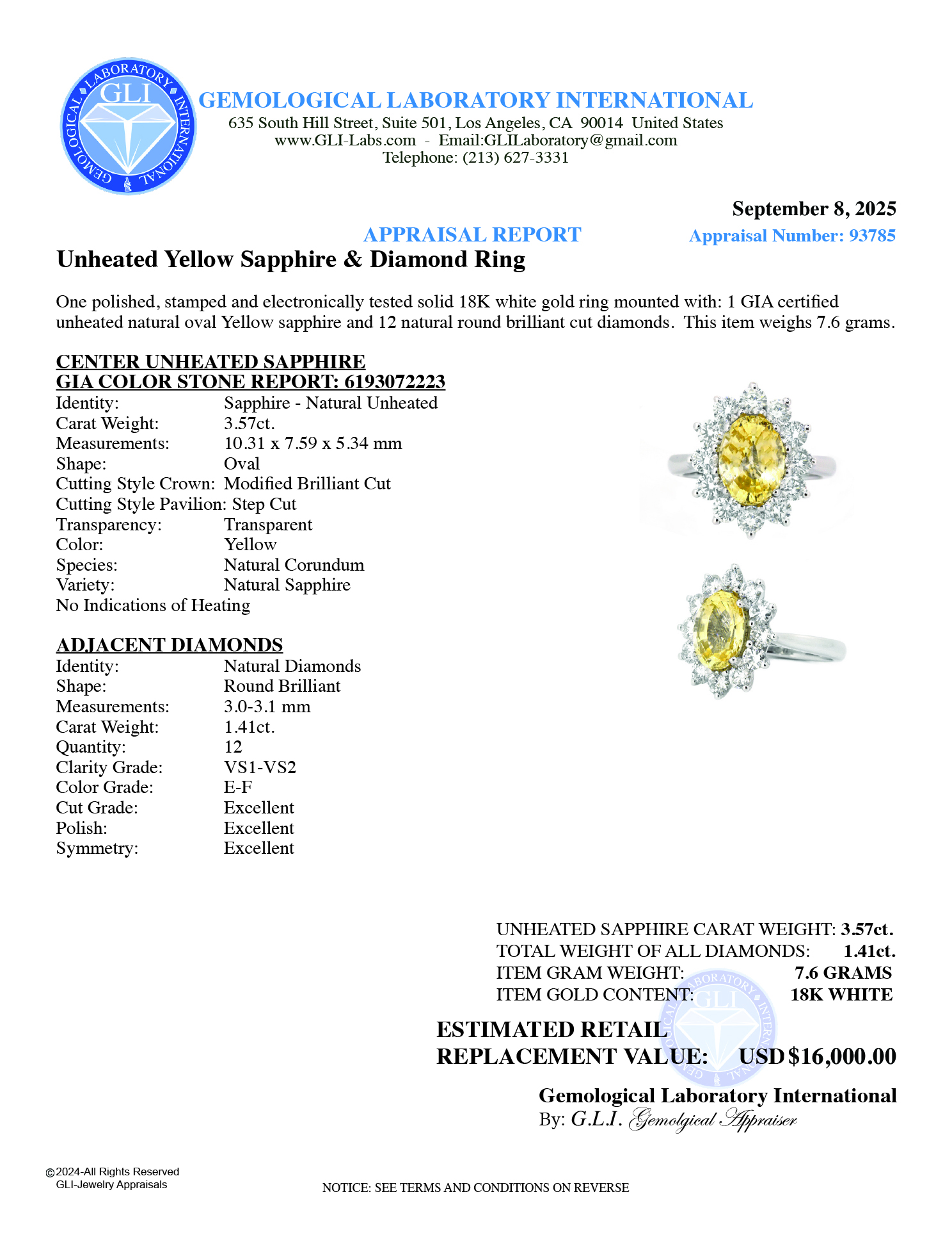 Ring Center Unheated Oval Shape Yellow Sapphire 3.57ct (GIA Color Stone Report: 6193072223) No Indication of Heating