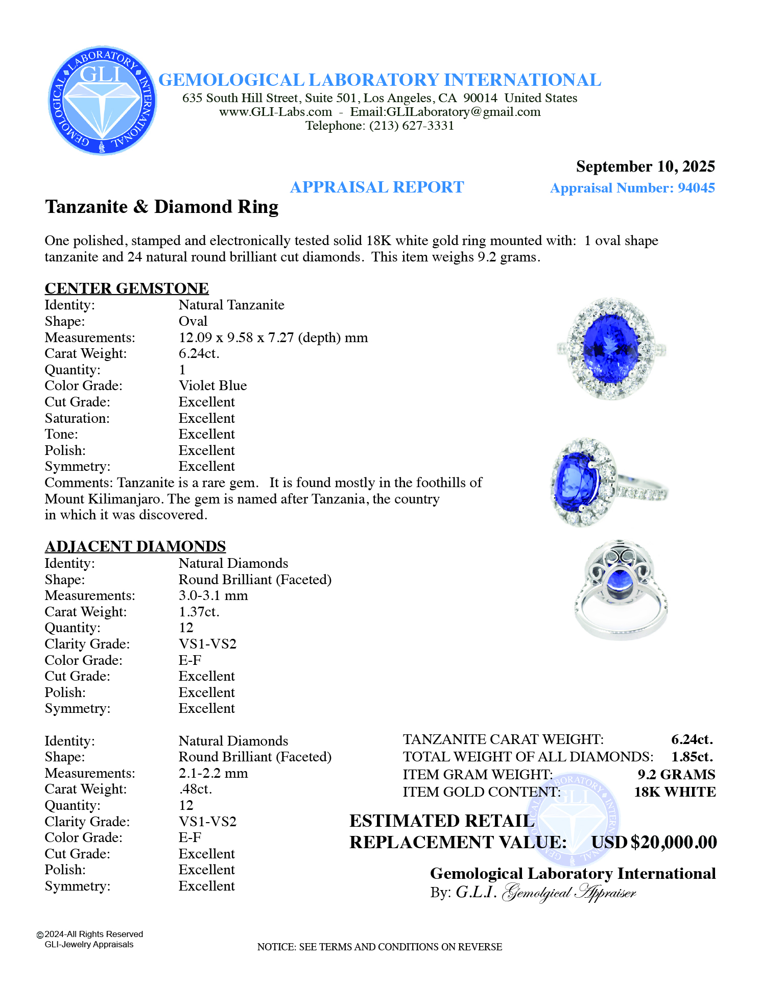LOT 507 – RING CENTER VIOLET BLUE TANZANITE 6.24ct. DIAMONDS 1.85ct.tw. 18K – 9.2 GRAMS