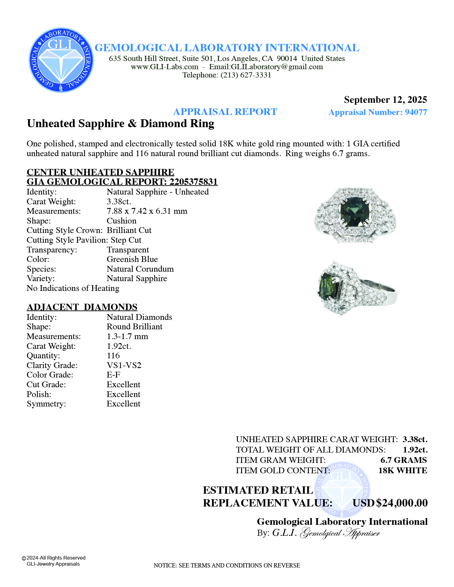 Ring Center Cushion Shape Natural Unheated Sapphire 3.38ct. Color: Greenish Blue (GIA Gemological Report: 2205375831) No Indication of Heating
