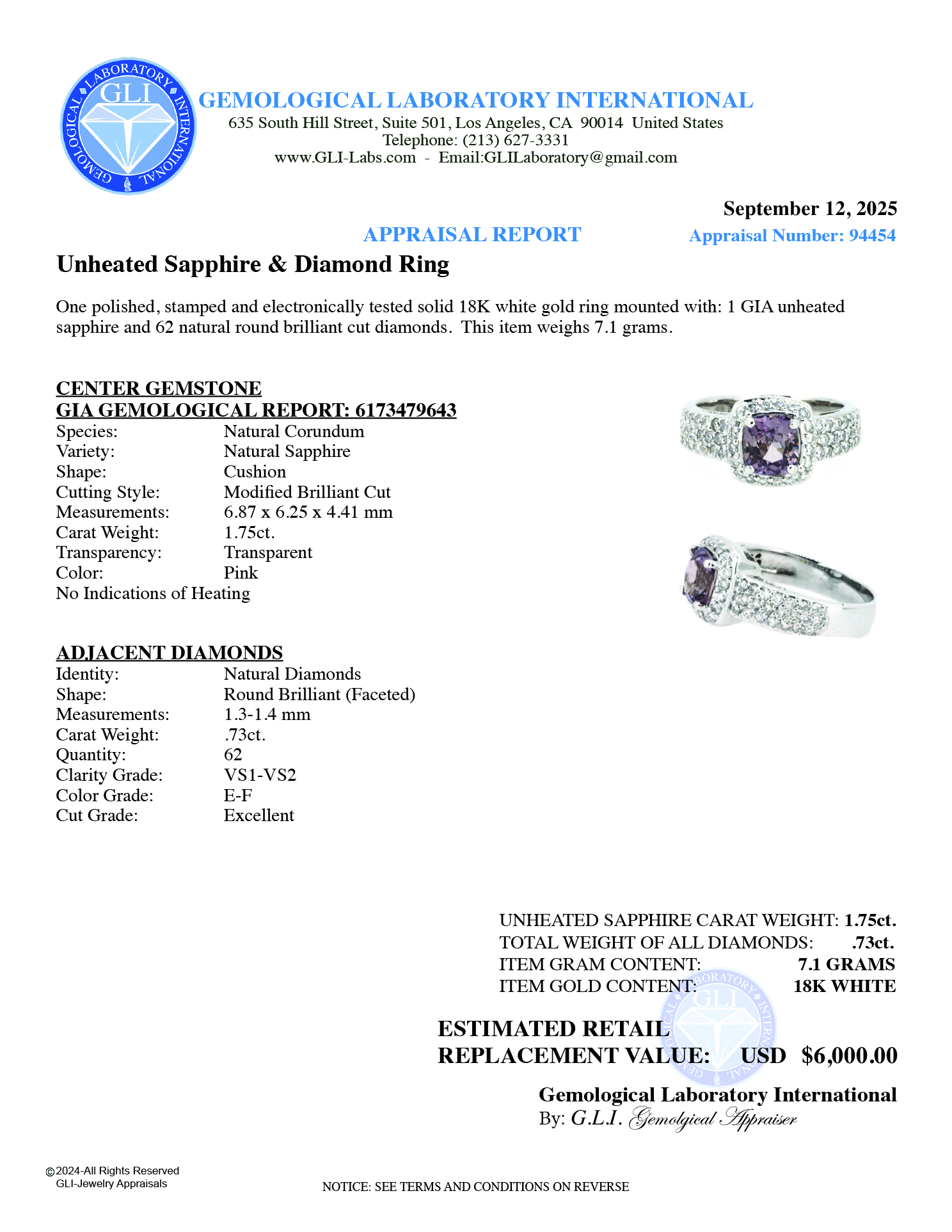 Ring Center Unheated Cushion Shape Pink Sapphire 1.75ct (GIA Gemological Report: 6173479643) No Indications of Heating