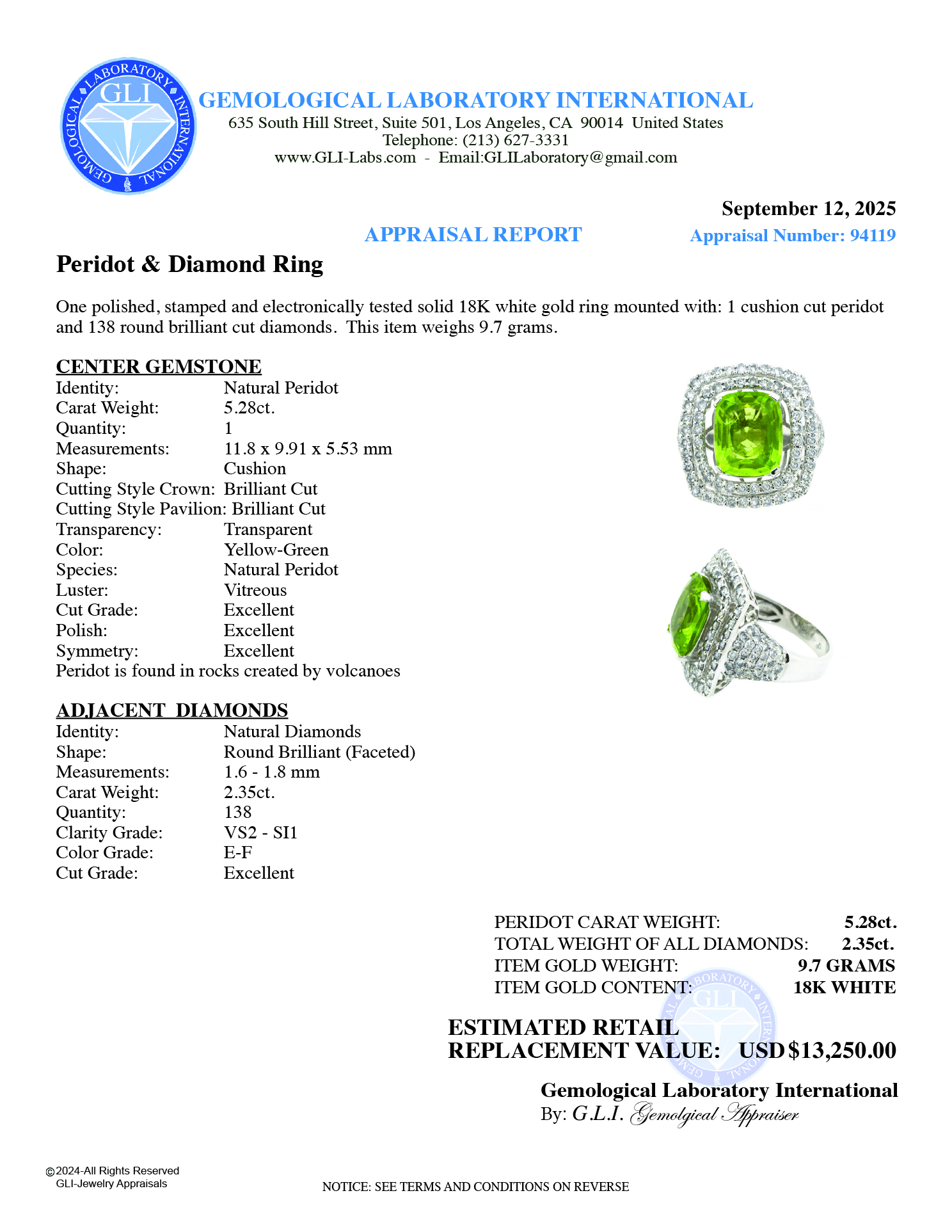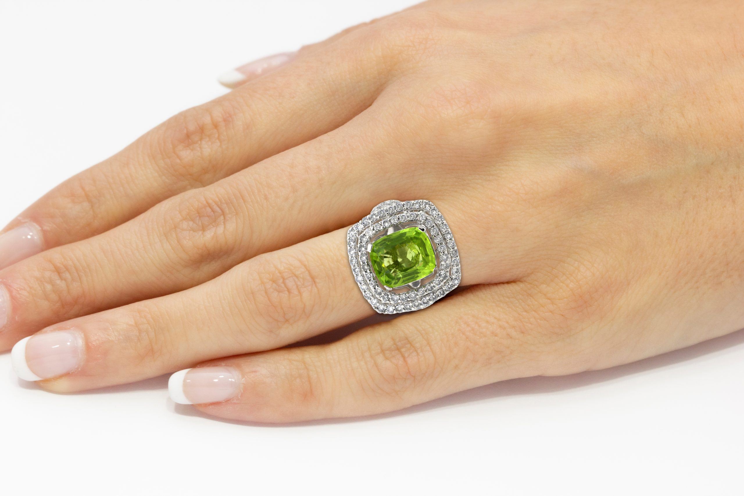 LOT 635 – RING CUSHION SHAPE YELLOW-GREEN PERIDOT 5.28CT. DIAMONDS 2.35CT.TW. 18K