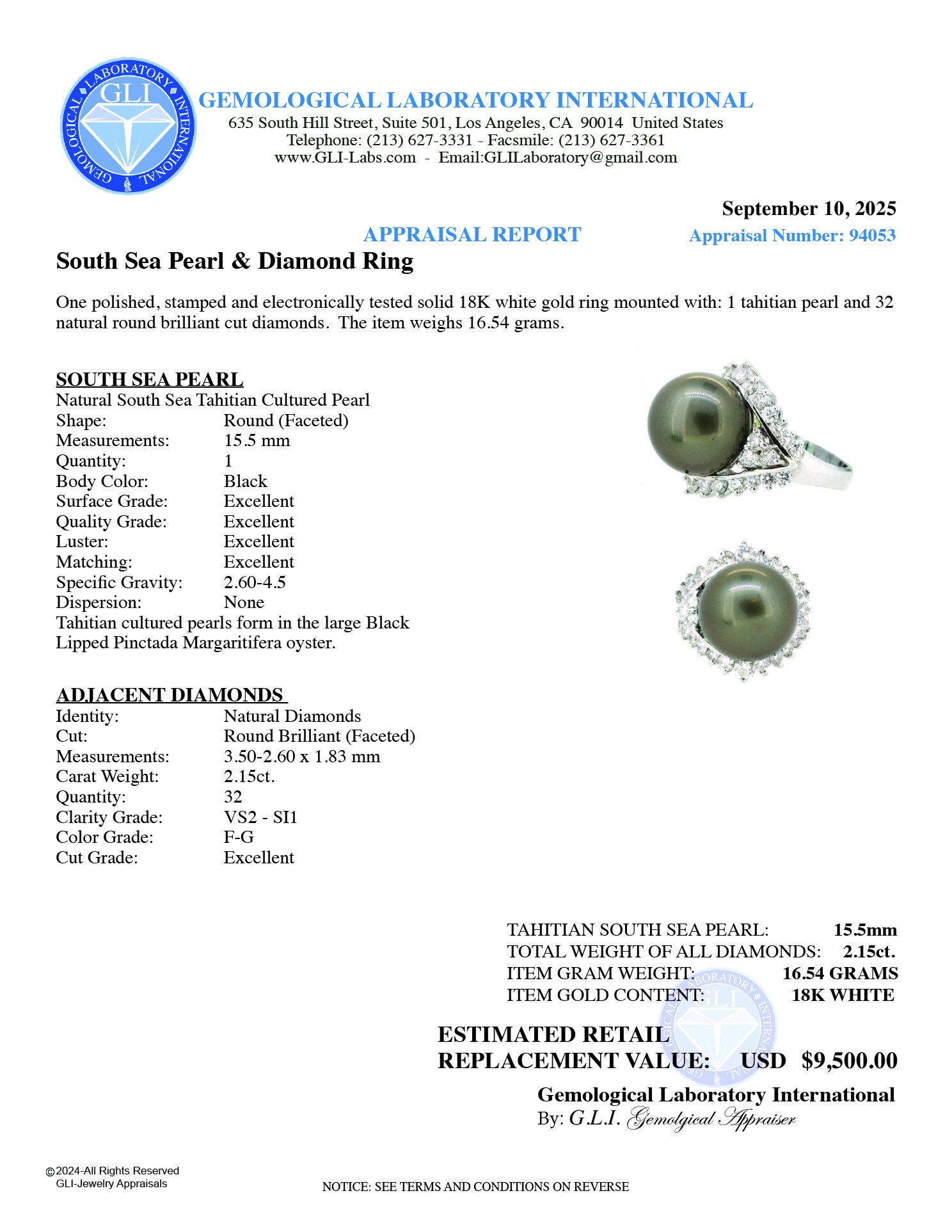 LOT 581 – RING NATURAL SEA PEARL 15.5MM DIAMONDS 2.15ct.tw. 18K