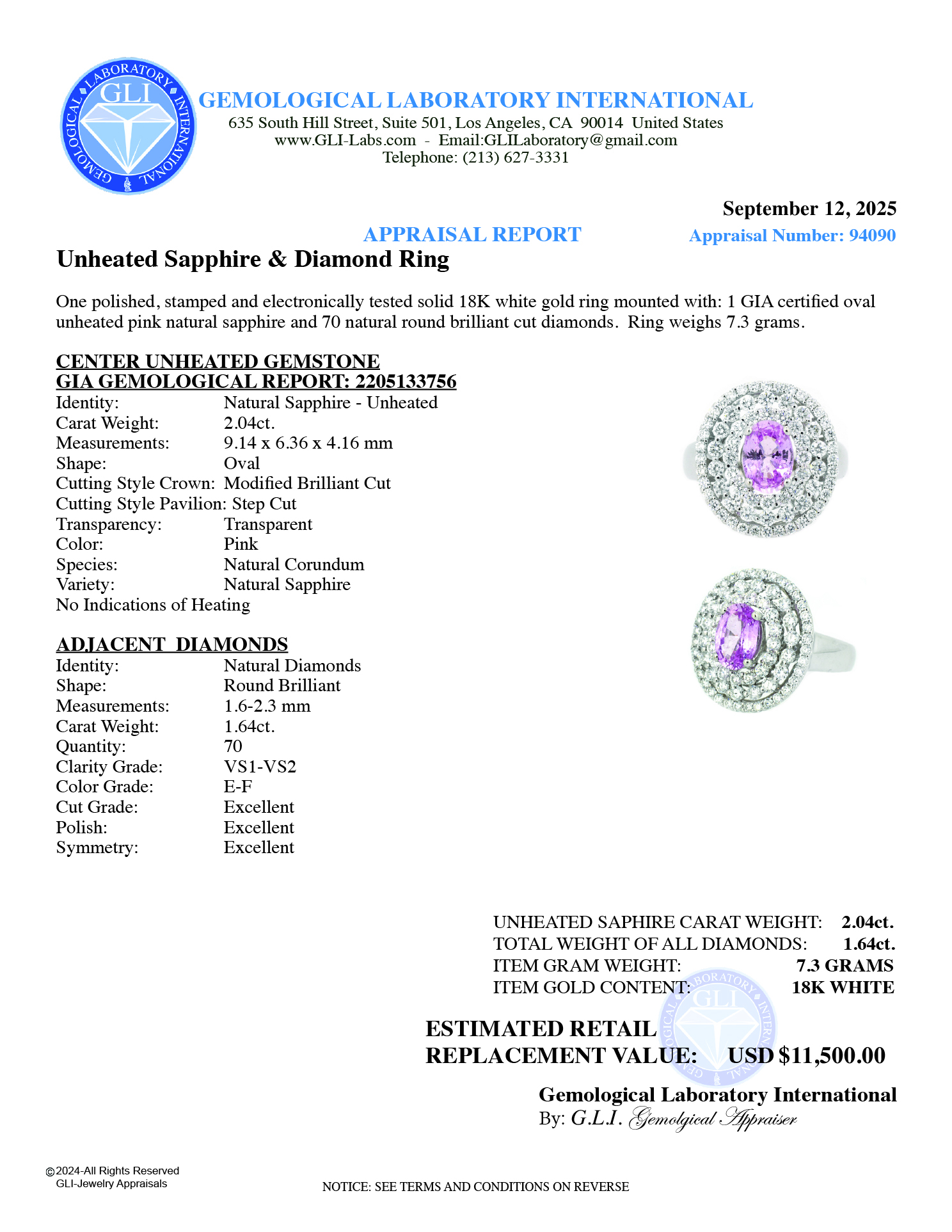 Ring Center Natural Unheated Oval Shape Color: Pink Natural Sapphire 2.04ct (GIA Gemological Report: 2205133756) No Indication of Heating Adjacent