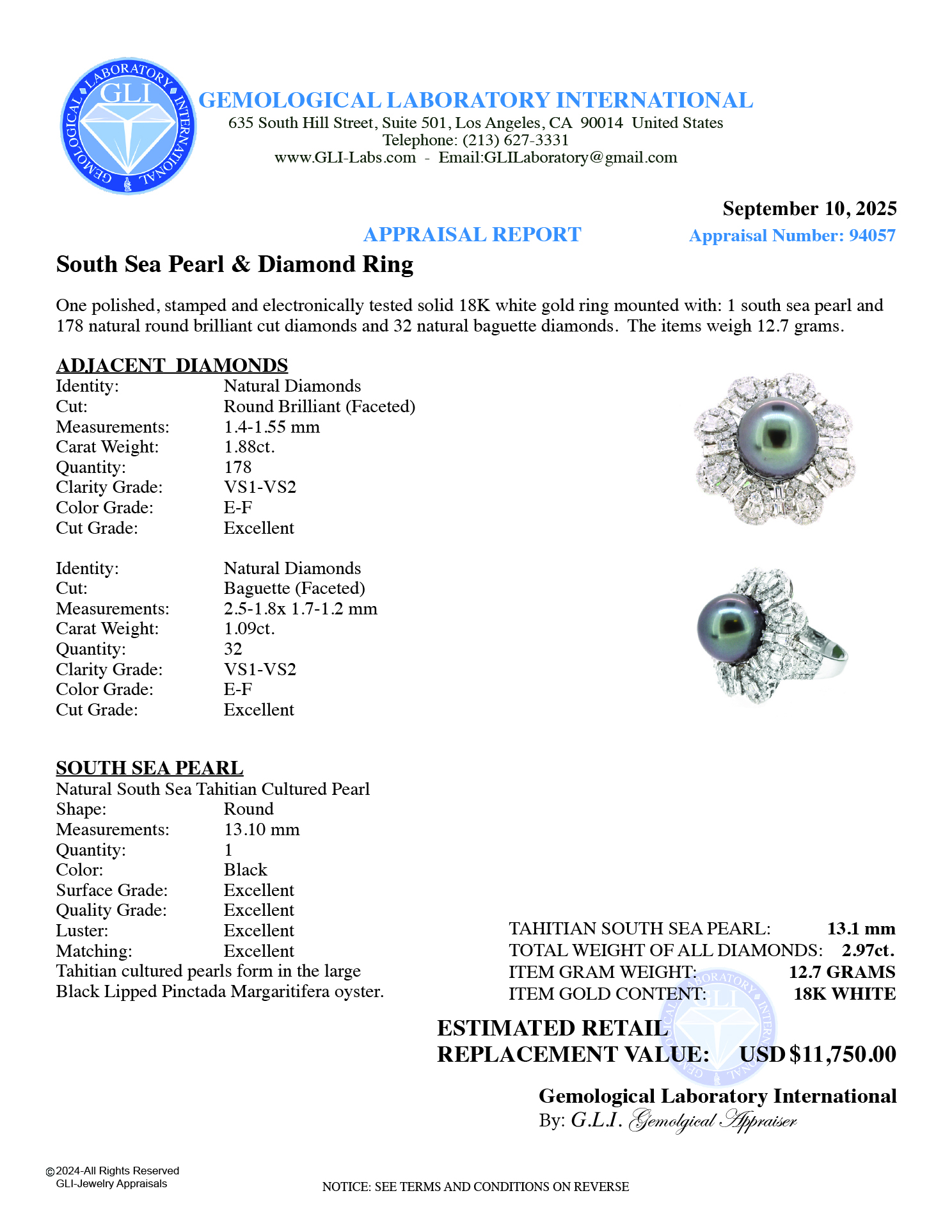 LOT 597 – RING SOUTH SEA PEARL 13.1mm (210) DIAMONDS 2.97CT.TW 18K