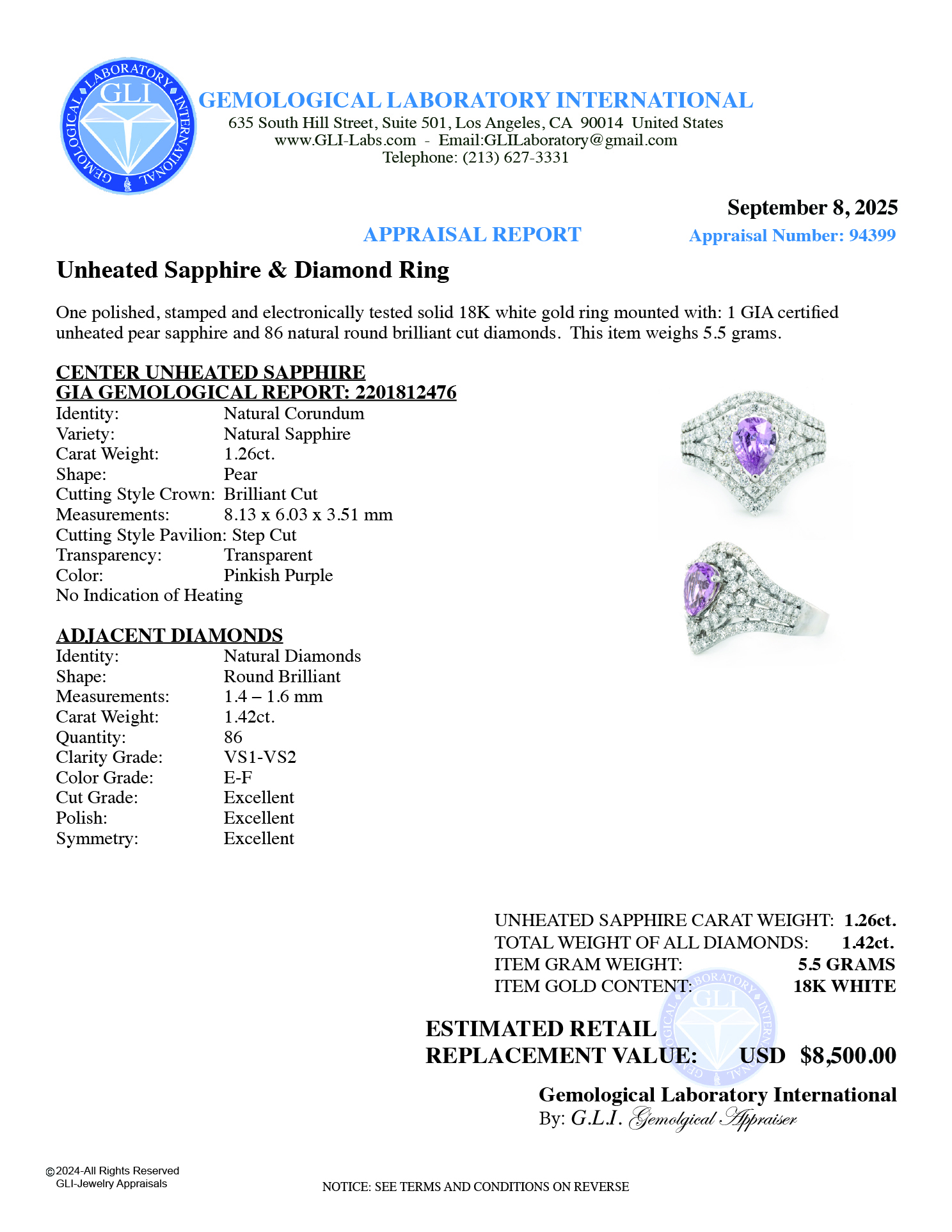 Ring Center Natural Unheated Pear Shape Pinkish Purple Sapphire 1.26ct. (GIA Gemological Report: 2201812476) No Indications of Heating